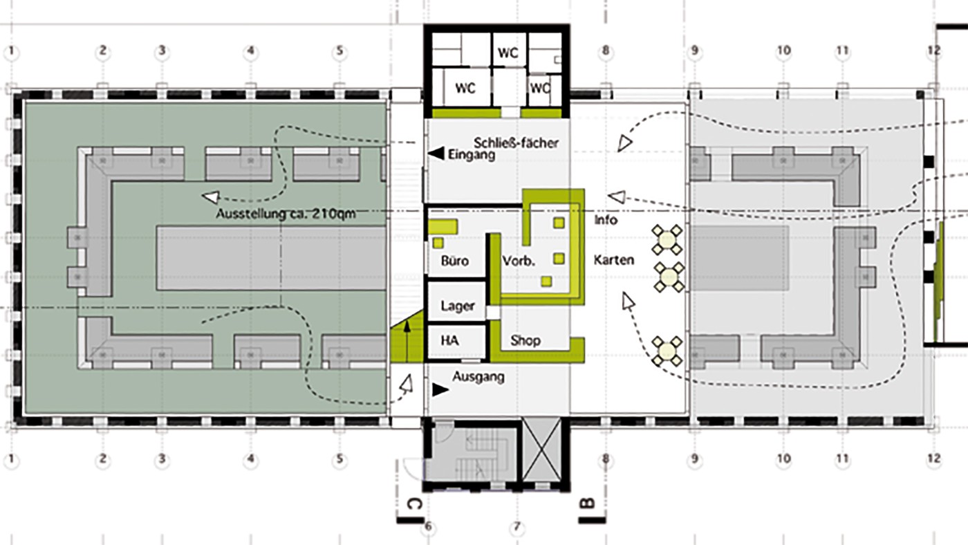 Das moderne Besucherzentrum fügt sich über alle drei Geschosse als "Haus im Haus" in die historische Bausubstanz ein, grenzt sich jedoch stilistisch und hermetisch vom unbeheizten Bestand klar ab.