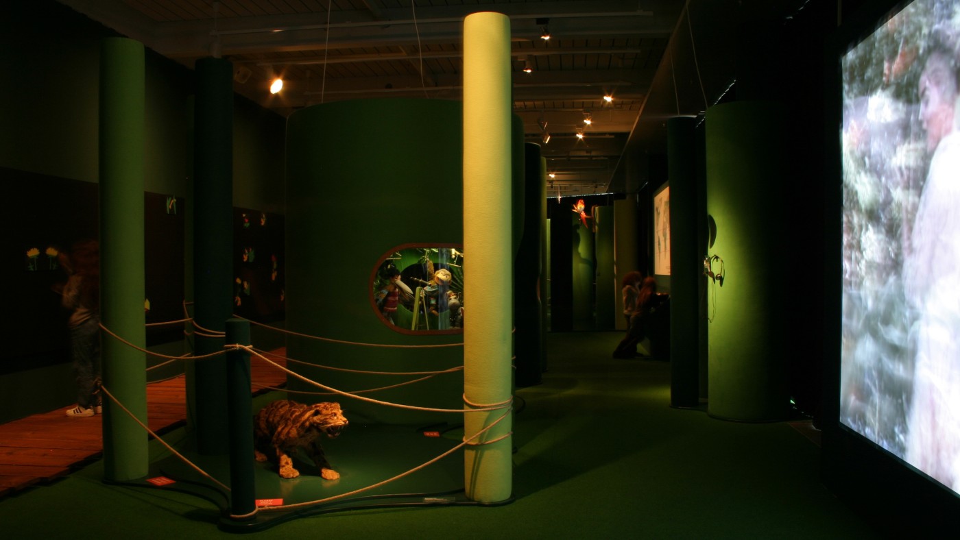 Die Ausstellung scheint zuerst kaum begehbar, wie im dichten Urwald versperren zahlreiche abstrahierte und unterschiedlich dicke Baumstämme den Blick. Es sirrt, knistert, pfeift von einer 16-Kanal-Toninstallation, die die Bewegungen von Tieren im Dschungel imitiert. Auch Tarzan schwingt sich von Liane zu Liane. Kinder schlüpfen durch die Bäume aus weichem, flexiblem Material wie durch das Dickicht eines Urwalds, und die Wege öffnen sich zu Lichtungen. Es gilt, in die Urwaldatmosphäre einzutauchen und die Filme im Dickicht des Dschungels zu entdecken.
