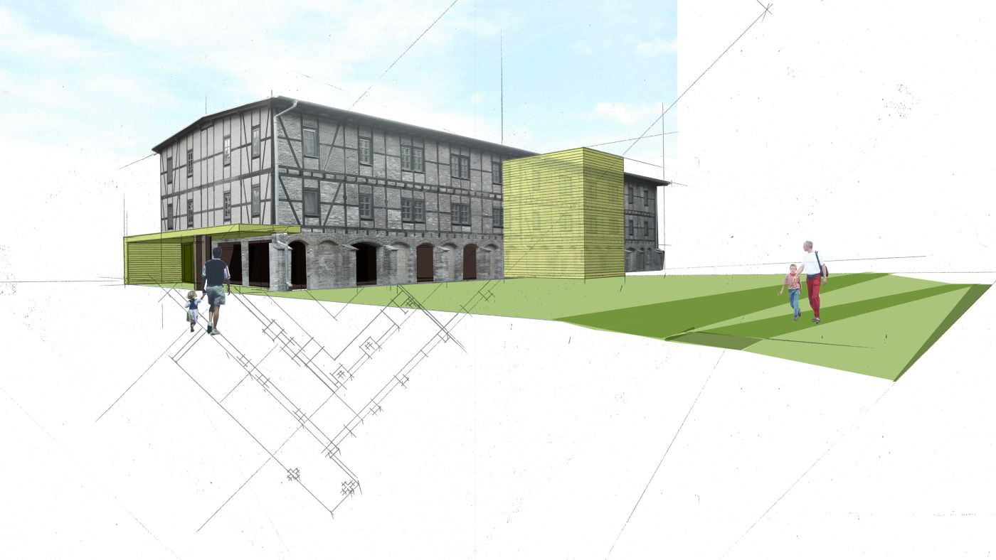 Within the protective shell of the former brickworks the modern visitor centre is conceived as a “building within a building”. The front third of the existing building is preserved in its existing condition; empty and unheated.