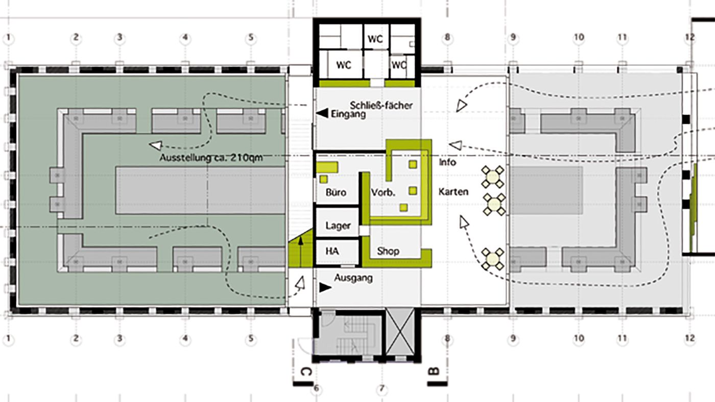 An entire section in the middle of the building is opened up creating a lobby and giving visitors a view of the different storeys comprising the front section and their respective industrial functions. A new centre structure visible from outside serves to improve visitor circulation and house all the necessary visitor facilities and utility rooms. The main entrance designed in a corresponding style is added to the front façade, granting visitors immediate access through the historical substance.