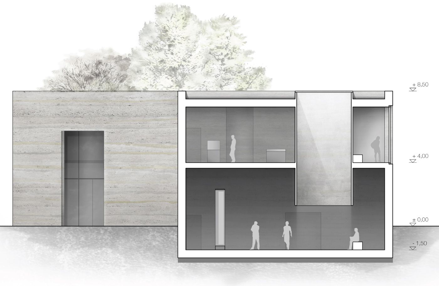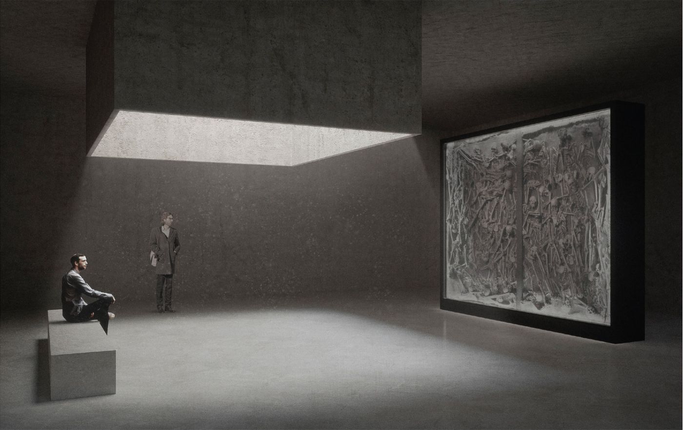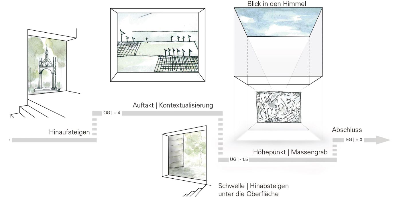 A design for the extension of the memorial was developed with respect, restraint and spatial clarity. It provides a dignified setting for an extraordinary exhibit and a sombre visitor experience: a mass grave containing the remains of 47 soldiers from the Battle of Lützen in 1632. The new architecture envelops this find as a protective space for focussed contemplation, communication and reflection. At the centre is the grave itself – placed upright in the room – a harrowing testimony to the Thirty Years' War, scenographically staged.