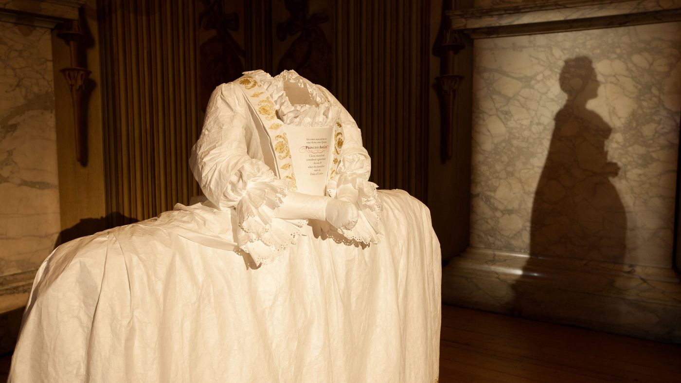 The exhibition „The Glorious Georges“ celebrates the 300th anniversary of the Hanoverian accession to the British throne. The history of the early Georges and their court is animated by spectacular audio-visual installations that bring the Georgian Court to life. In the Cupola Room, two figures stand facing each other. With the sound of shoes on the wooden floor their shadows begin to move on the marble wall surfaces. Princess Amelia and the Duke of Grafton dance the minuet. Their motion combines with the space and the music to transport the visitor back into the time of George II.