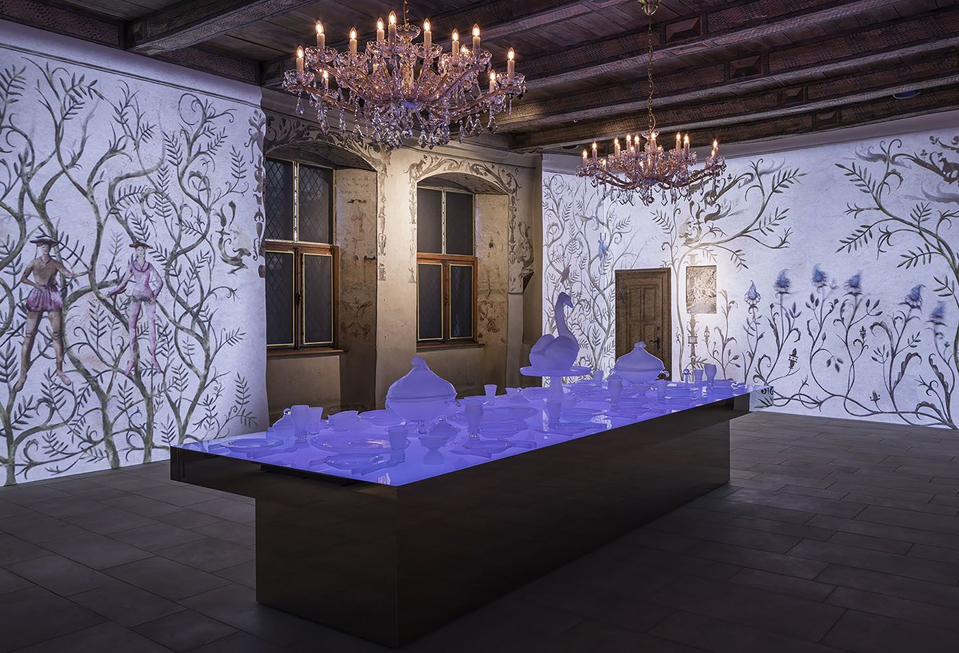 Upon entering the great hall of Vischering Castle – a moated medieval fortress in Westphalia – a captivating installation unfolds: historical wall frescoes come to life through dreamlike film projections. Duncan McCauley has created a film installation that immerses visitors in the world of Westphalian nobility around 1750. Scenes of hunting, dining and dancing merge with fragments of mural painting into a marvellous allegory. The projections are synchronised with chandeliers and a central banquet arrangement of hand-blown table ornaments, while the layered sound design creates a stirring atmosphere. Finally, the original frescoes return to focus – now seen in a new light.