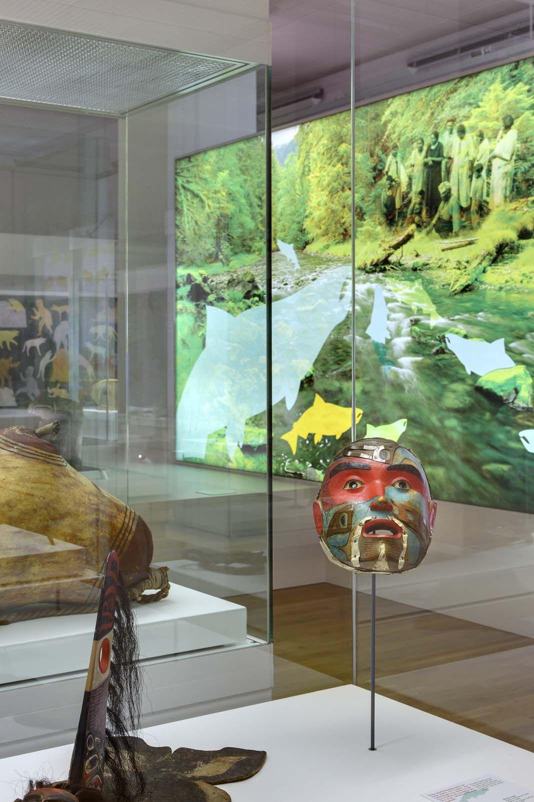 The exhibition includes religious artifacts and everyday objects, some thousands of years old, that reflect the lives of the Inuit, Métis and the peoples known as the “First Nations”. The significance of time, the seasons and daily rhythms conjures up a sense of the First Peoples’ close ties to nature. Visitors experience this harmony through atmospheric light and sound installations, which create a dramatic mise-en-scène. The exhibits are presented within the context of a visitor-friendly narrative structure and not as isolated objects seen from an academic perspective.