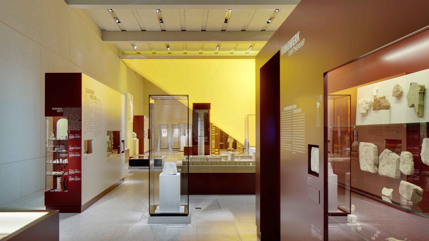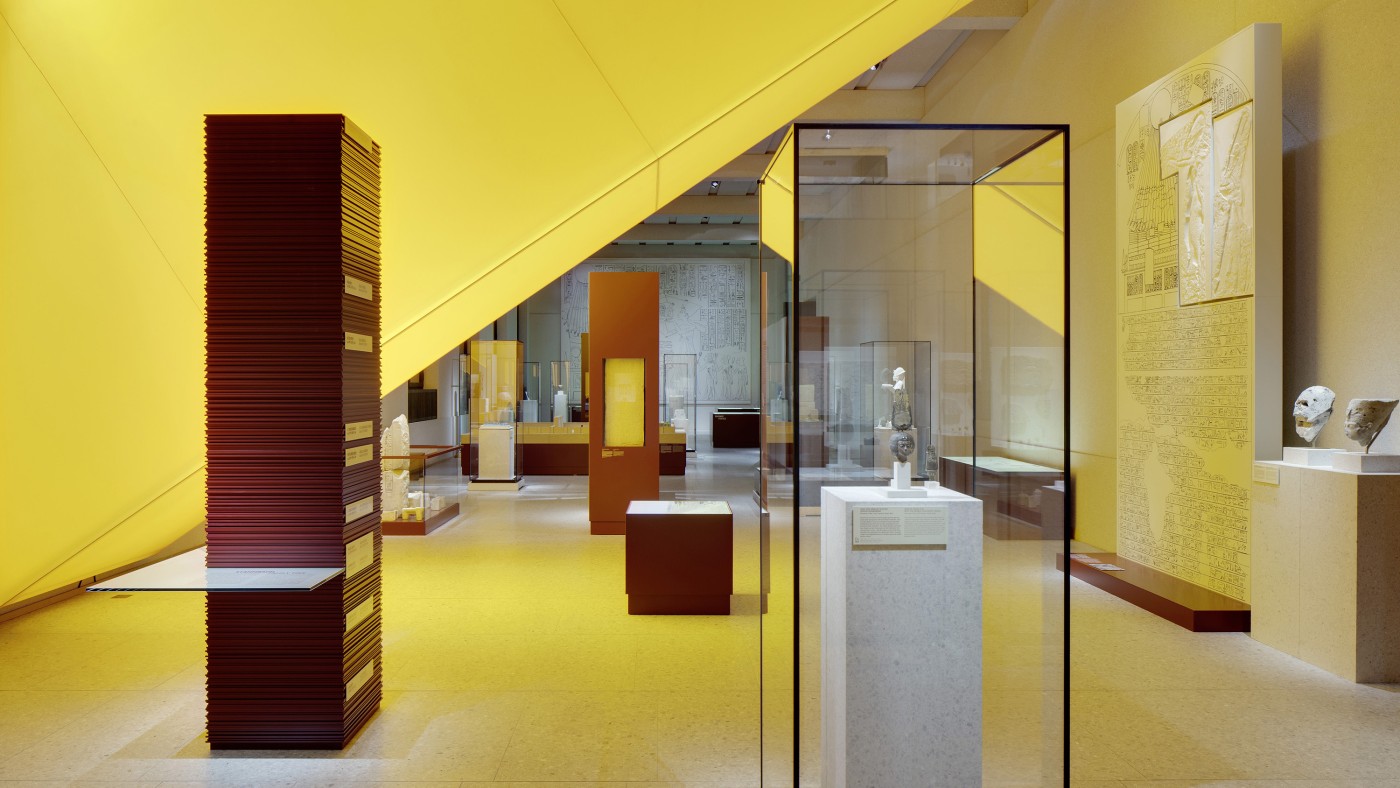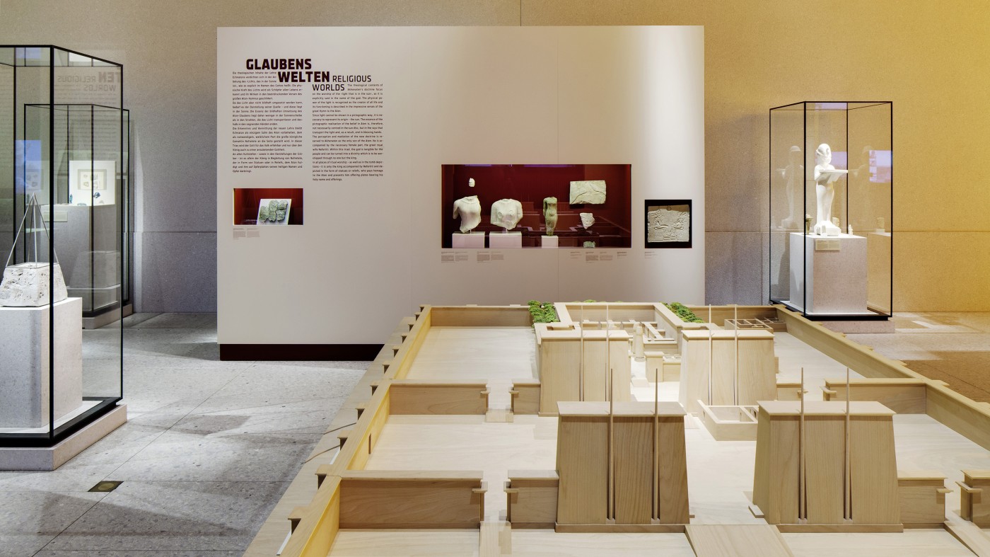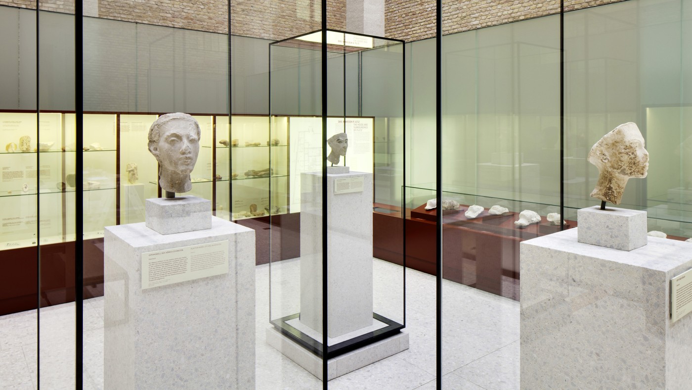 This special exhibition focuses on the bust of Nefertiti and the history of the Amarna period. The design concept aims to introduce and accompany visitors to the Amarna period. The incisive religious and cultural caesura of Akhenaten’s reign is symbolised by the “sun ray”, a triangular, ceiling-height light fixture with an integrated audio installation. This spatial staging symbolises the fracture of the Amarna period within Egypt’s history and the associated transition to a new phase.