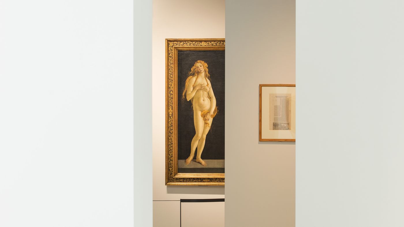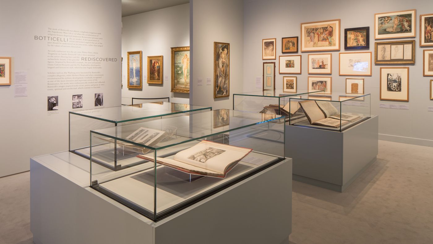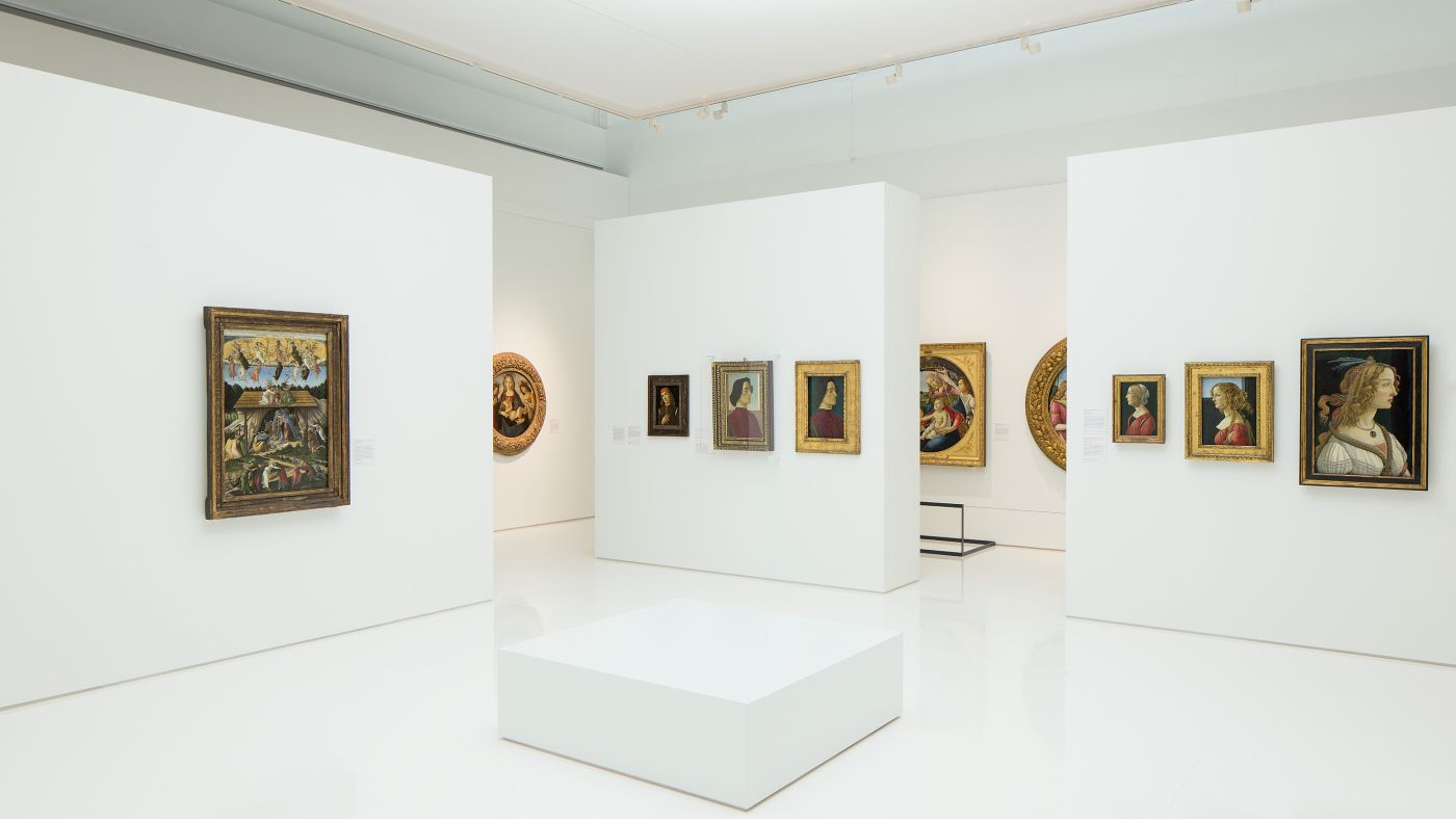 The design by Duncan McCauley follows the curatorial approach of a reverse chronology and has created specific atmospheres for the three spatial sequences. The visitors move from darkness into the light, from the present into the past. Sightlines between the rooms and between specific paintings allow the visitors to draw connections between the original Botticelli’s and the works they inspired. The narrative of the exhibition starts in the present and takes the visitor on a journey from the reception of Botticelli’s image of beauty and the influences of his work on twentieth century art, his rediscovery in the nineteenth century to the final room where the original Botticelli’s are displayed.