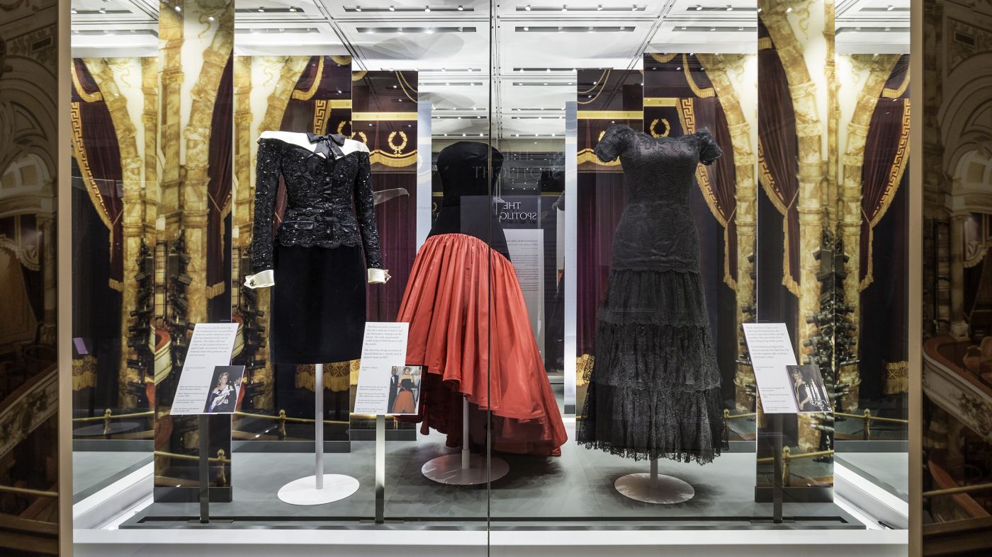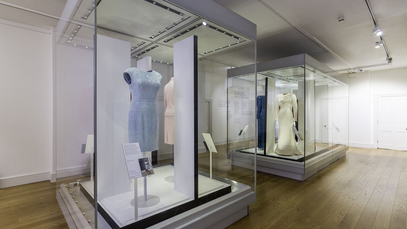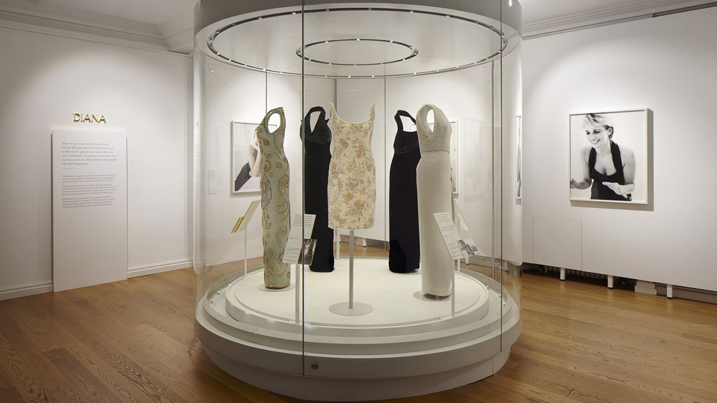 The show marks the 20th anniversary of the death of Diana, Princess of Wales and celebrates the fashion legacy of the popular princess. Through the presentation of Diana’s most memorable garments, visitors experience the fascinating evolution of her unique style, that she developed together with world renowned fashion designers. Each exhibition room is dedicated to a specific aspect of Diana’s fashion style and is designed with a specific atmosphere. The exhibition opens with an immersive ornate patterned installation evoking the perception of Diana as a fairy tale princess. Incorporeal mannequins were designed to emphasize the elegance and elaborate nature of the dresses, presenting them floating within the showcases. In the following spaces, selected gala dresses are presented in a theatrical setting giving prominence to her activities as a patron of the arts. The outfits she wore for diplomatic purposes are presented with each dress individually framed. In the final room a series of dresses highlight the glamour and confidence of Diana’s late style. Visitors are invited to reflect on her transformation from fairy tale princess to a world renowned fashion icon.